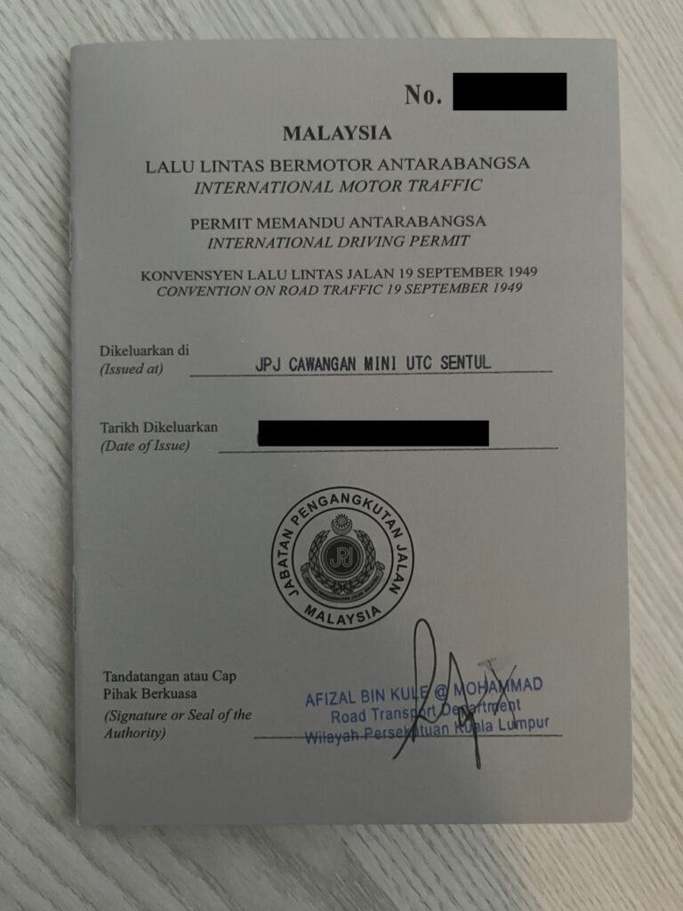 UTC SentulのJPJで発行された国際運転免許証(IDP)は、見慣れたグレー色の紙製のブックレットタイプでした。